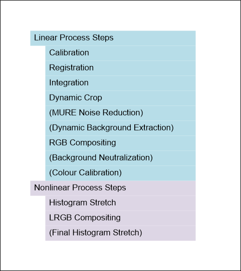 Taking that into account, my initial workflow looks like this. Some of the steps (in parentheses) could be dropped in a pinch just to create a simpler process. Note the division of steps into linear followed by nonlinear, with the data becoming nonlinear after the initial histogram stretch. As mentioned earlier, as additional steps are added to the workflow it is important to note which group they go into so as to fit them into the process at the most appropriate point.